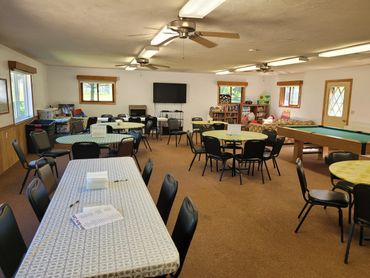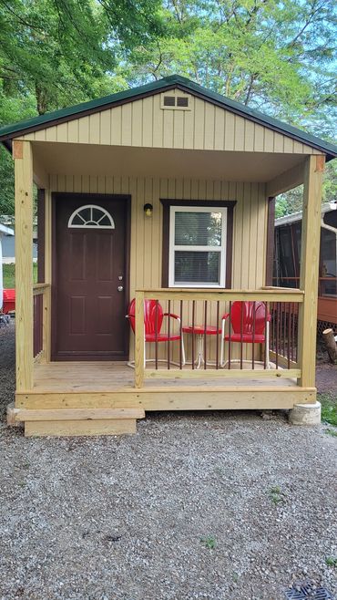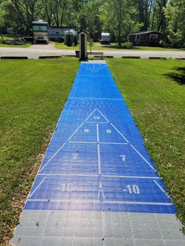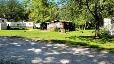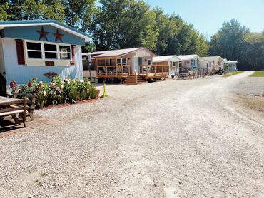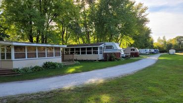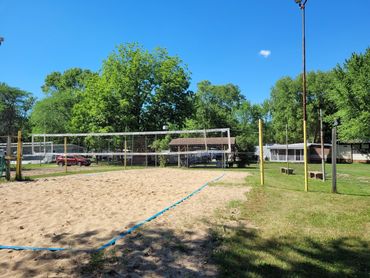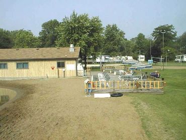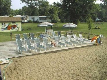 The facilities include a very nice clubhouse with a screened in porch and a huge deck for sunbathing. Also in this building are a snack bar and a whirlpool room. For swimming we have a very clean pond (chlorinated) with a nice sandy beach. Two fenced, sand volleyball courts are available. There are 20 spaces for RV with water and electrical hookups.